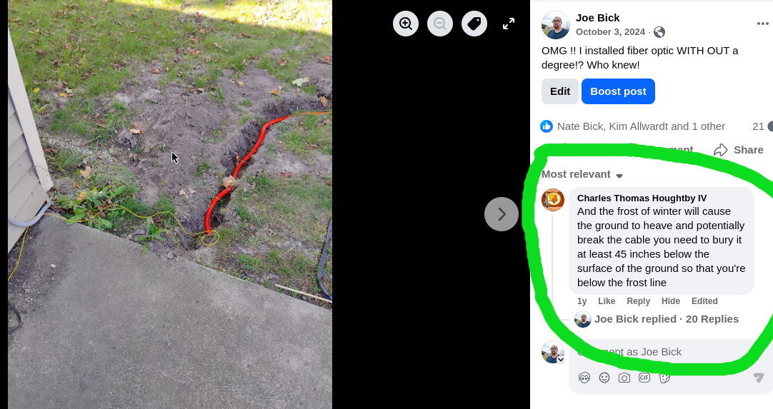 Back in November of 2024 I installed a fiber optic link spanning from my house into my shop solar facility. I dug a trench utilizing a Blue Viper hand shovel. I put the cable into nice orange conduit from Amazon.