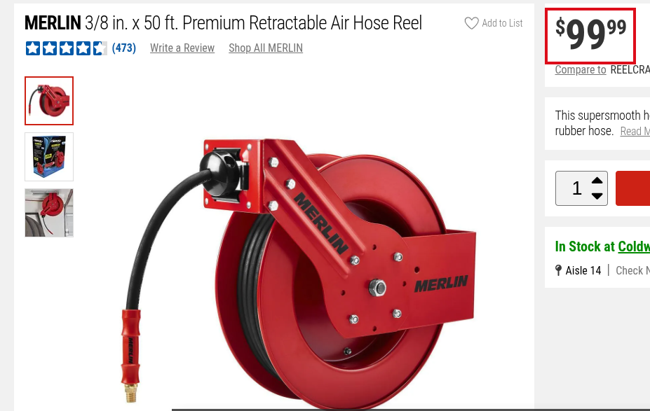 Harbor freight has a nice air hose reel for a fraction of the price of the all in one reels I have seen over the years. You have to assemble the reel yourself and supply your own air hose - which is perfect for me - I have a lot of 3/8 air hose. It's the 100 foot open steel air hose reel.